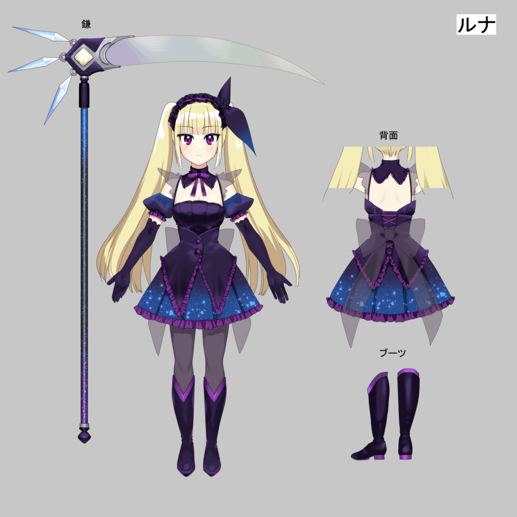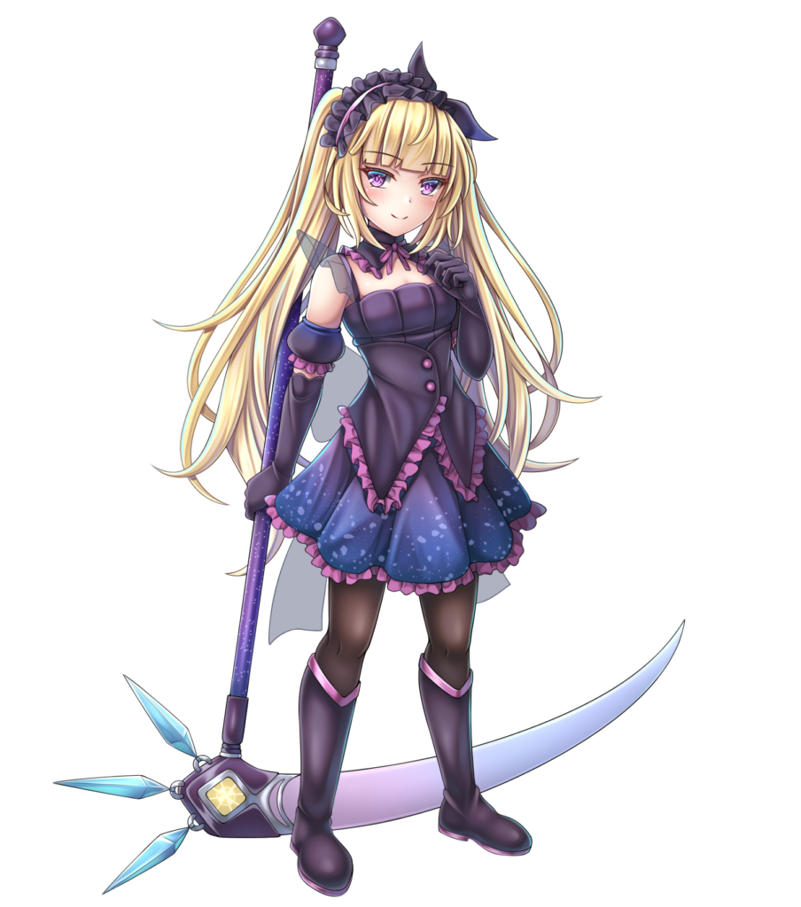 濃紫を基調としたマジックドレスを身にまとい、聖光珠をセットした大きな鎌を武器として戦う。